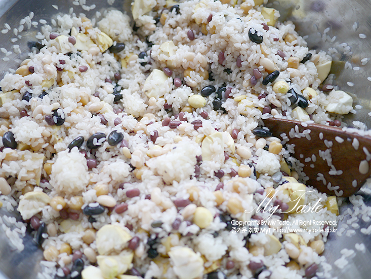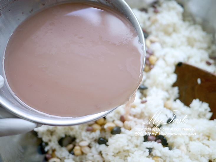 5. 찐 찹쌀과 3의 삶아둔 콩 범벅 그리고 팥물, 소금을 넣어 살살 섞어 주세요.